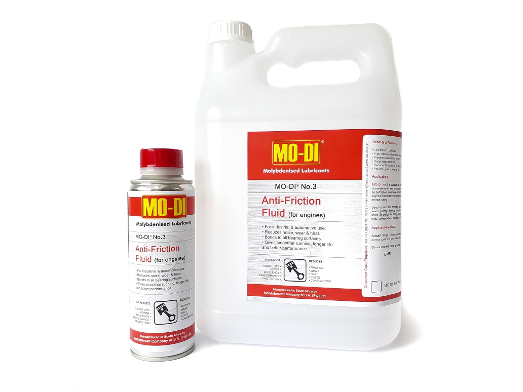 MO-DI No.3 is a solid lubricant anti friction fluid in colloidal suspension for automotive and industrial use in conjunction with all light lubricating oils. It reduces wear to a minimum and is the most efficient boundary lubricant suitable for internal combustion engines.